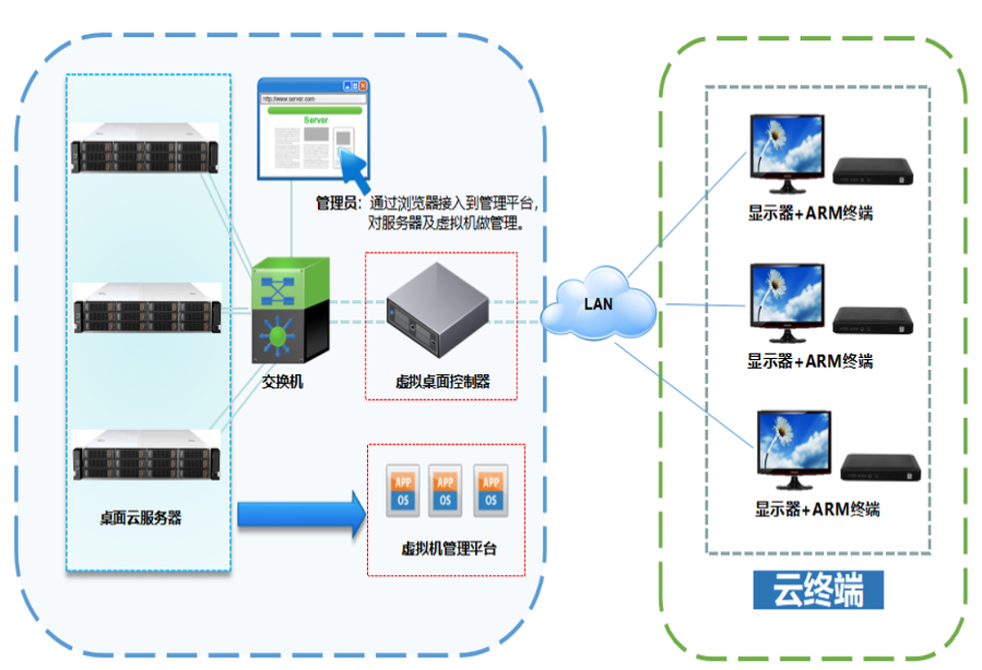 整体云桌面方案是由云终端Thinclient、虚拟桌面控制器OVD、虚拟机管理平台OVP、服务器存储设备等组成,将用户桌面统一部署于服务器上,个人数据也集中存储,然后通 过网络将个人桌面系统快速交付给用户,用户可以通过各种不同类型的终端设备如云终端、 笔记本、手机及平板等随时随地接入使用,打造一种新型的桌面交付模式。
