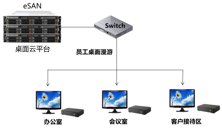 灿光融合云桌面将桌面虚拟化及存储虚拟化技术相融合,其中,桌面虚拟化技术通过专门定制的硬件平台,全面整合服务器计算资源,通过云终端替代传统PC机,真正做到了“桌面漫游”和终端管理零维护;存储虚拟化技术则是将服务器中的硬盘资源组成一个大的存储资源池,并且可以将其灵活地分配给各个云桌面。最终实现多台服务器计算资源与存储资源的融合,从而使得整个云桌面架构更简单、更灵活、更可靠、更高性价比。